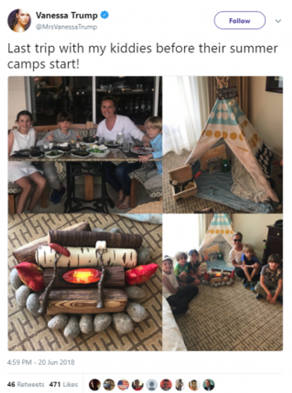 "Last trip with my kiddies before their summer camps start!" Trump wrote on Twitter, along with pictures of her smiling kids posing with assorted camping supplies.