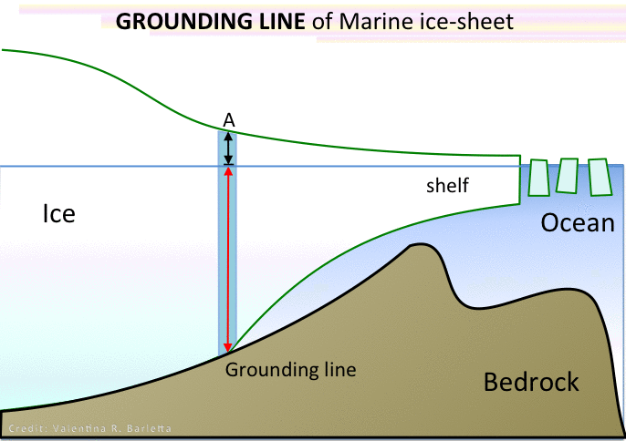 Stability of West Antarctic Ice Sheet depends critically on where it is floating and where it is in contact with seafloor bedrock or sediments. The demarcation between grounded and floating regions is called the grounding line – this is the point deep beneath the ice sheet where it no longer in contact with land but is floating in ocean waters instead.