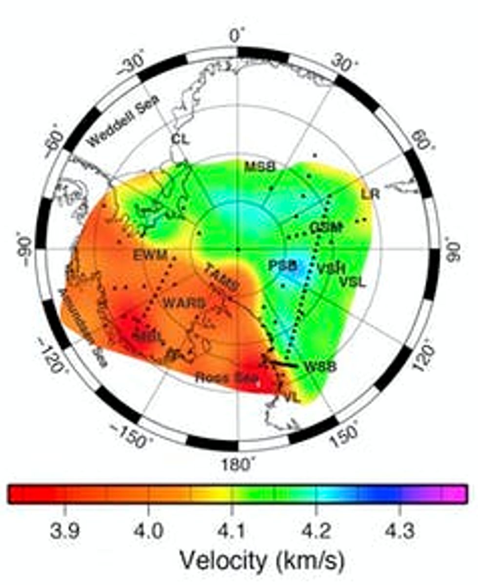 Slow seismic wave speeds in the mantle below the West Antarctic Rift System (WARS) and Marie Byrd Land (MBL) in West Antarctica indicate warm, low-viscosity mantle that leads to rapid uplift as ice mass is lost from the region.