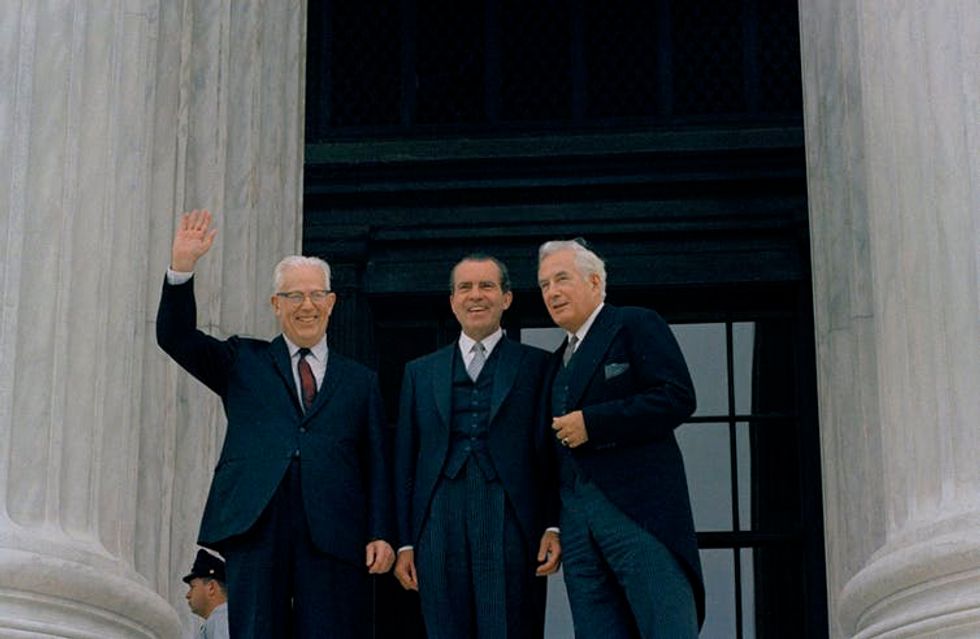 President Nixon, flanked by outgoing Chief Justice Earl Warren, left, and incoming Chief Justice Warren Burger, right.