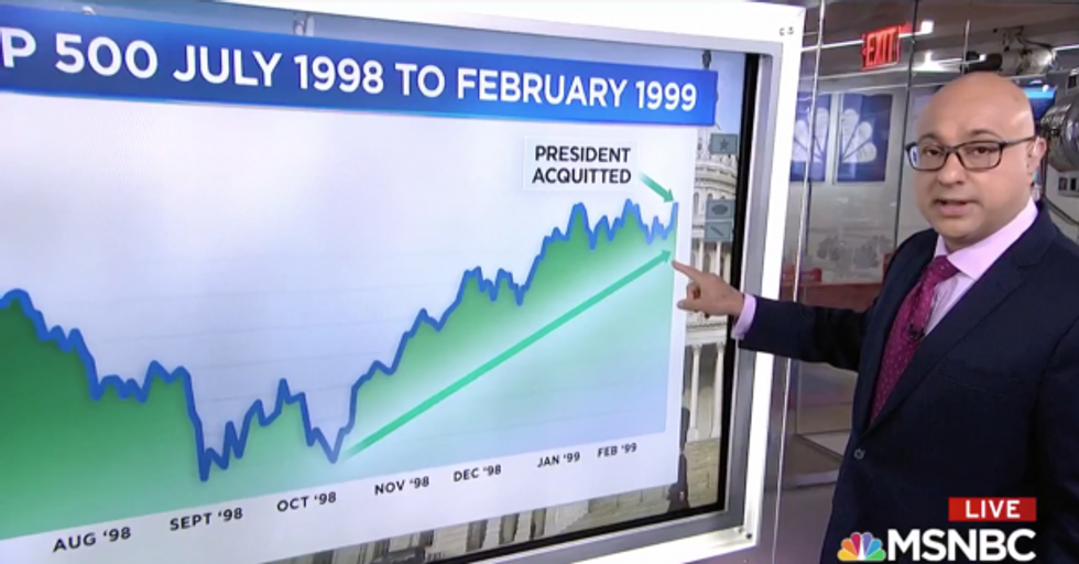 MSNBC host Ali Velshi walked through the history of former President Bill Clinton's impeachment and the impact on the markets. When the Ken Starr investigation was announced, the market did take a downturn, but it then rebounded. It went down again when articles of impeachment were filed in Congress. From that point until Clinton was acquitted by the Senate, the market gained 28 percent.