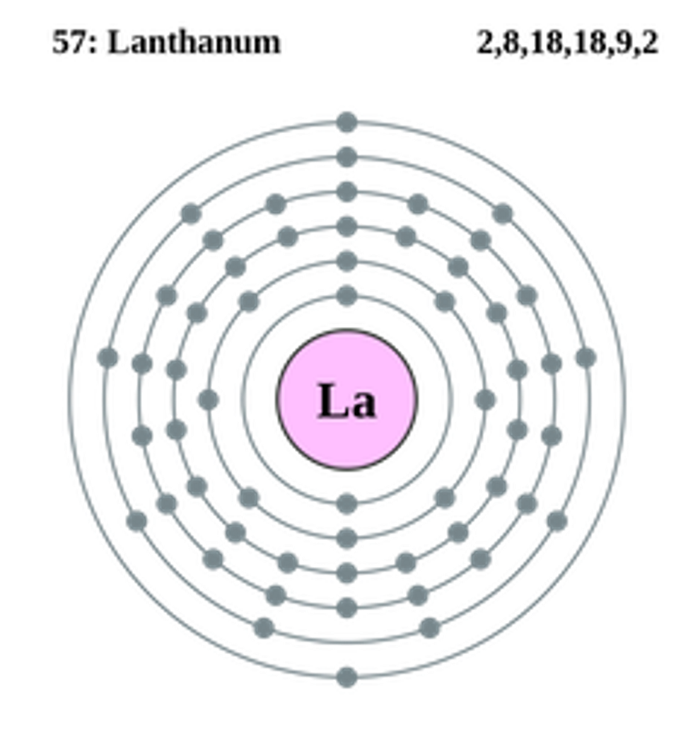 An electron diagram of a lanthanum atom, with one more electron in its fifth orbital than barium.
