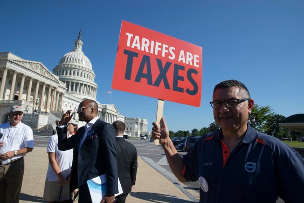 American auto workers demonstrate against trade tariffs they say will negatively affect U.S. auto manufacturing.