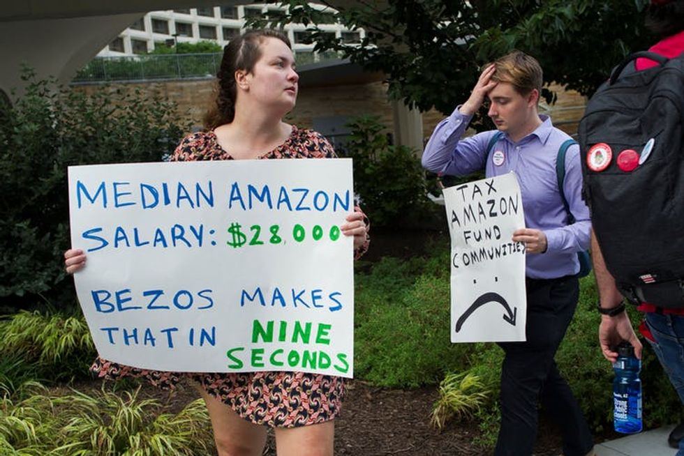 Demonstrators protested against Amazon and Jeff Bezos, Amazon founder and CEO, shortly before he announced plans to make $2 billion in charitable donations.