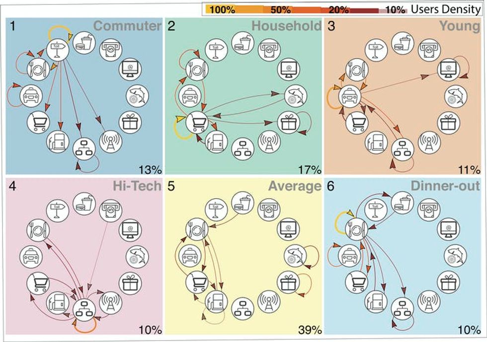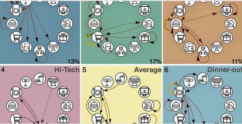 From the detected spending habits, we identify six groups or “tribes” while protecting people’s privacy by aggregating the data and ensuring they were anonymous. Each of these groups has a core purchase, which is the most frequent of their spending activities, indicated by the yellow arrows in the figure below.
