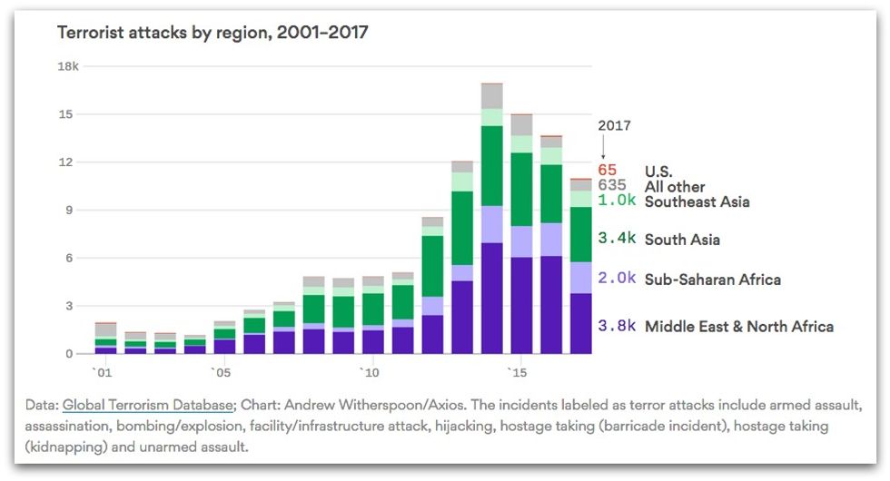 The focus of the report—titled Beyond the Homeland: Protecting America from Extremism in Fragile States—maintains a very U.S.-centric worldview. And while it does little or nothing to critically challenge the widely criticized policies pursued by the Bush, Obama, or Trump presidencies, its tabulation of the dramatic rise in destablized states and growing terrorist violence throughout the regions where the U.S. military has been most active since 2001—namely, the Middle East and North Africa, South Asia, and Sub-Saharan Africa—is nonetheless revealing.