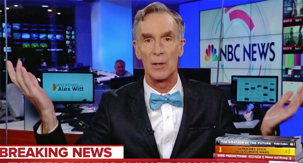Bill Nye, known as "the science guy," brought a stack of books and clipboard of charts with him for an appearance on MSNBC discussing climate change and hurricanes.