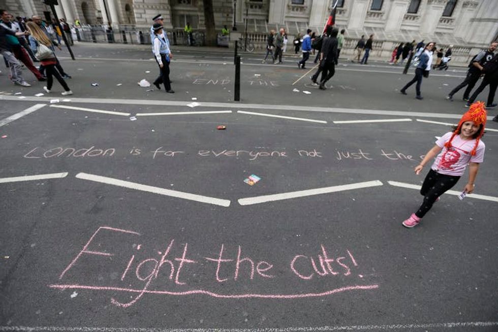 A girl smiles after writing slogans on Whitehall during a protest against the Conservative government and its austerity policies in London in June 2015.