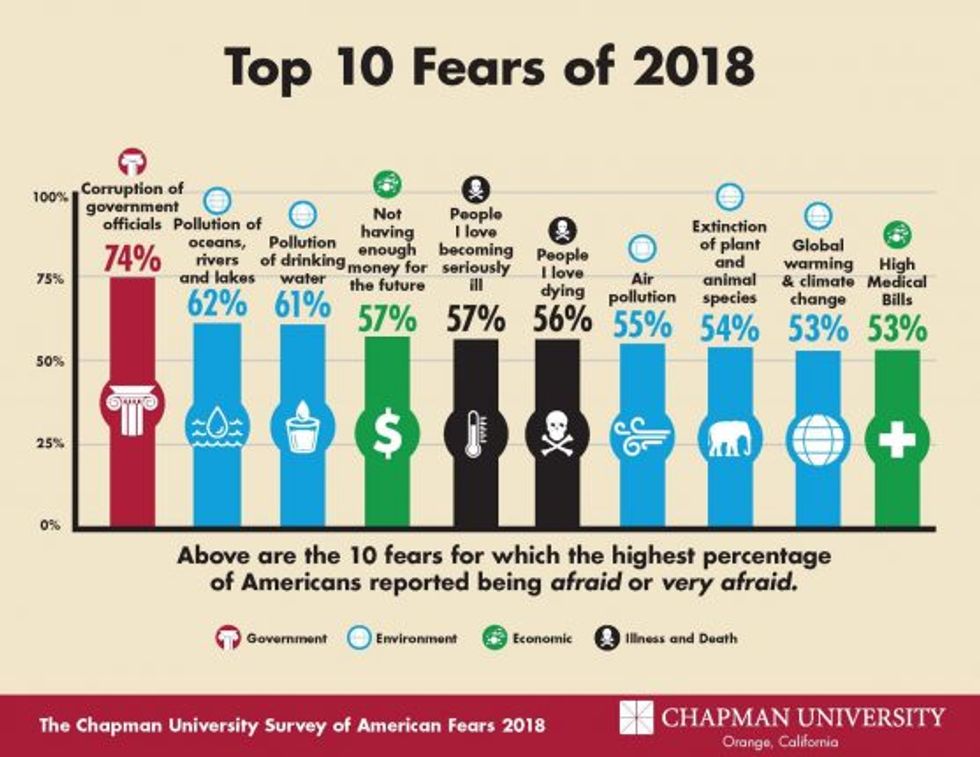 Each year, Chapman updates their survey as fears evolve over the year and release it before Halloween. Traditionally scary things like spiders, snakes, sharks and zombies are used to evoke horror. But they pale in comparison to things like environmental pollution, unsafe drinking water like in Flint, militias, Washington corruption (73.3 percent), an illness or that the U.S. will be involved in another world war.