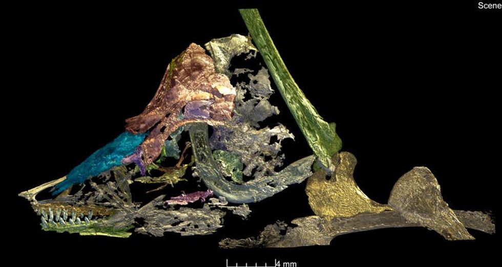 It is not well preserved and we nicknamed it “the ugly bird”, for the bones had become disconnected after it died and were jumbled together and crushed. The lower half of the body was missing completely. But we took it to Grenoble, to the European Synchrotron Radiation Facility (ESRF), where we were able to perform a virtual dissection of the skeleton, and piece together fragments of bones that had been broken when the animal died 150m years ago.