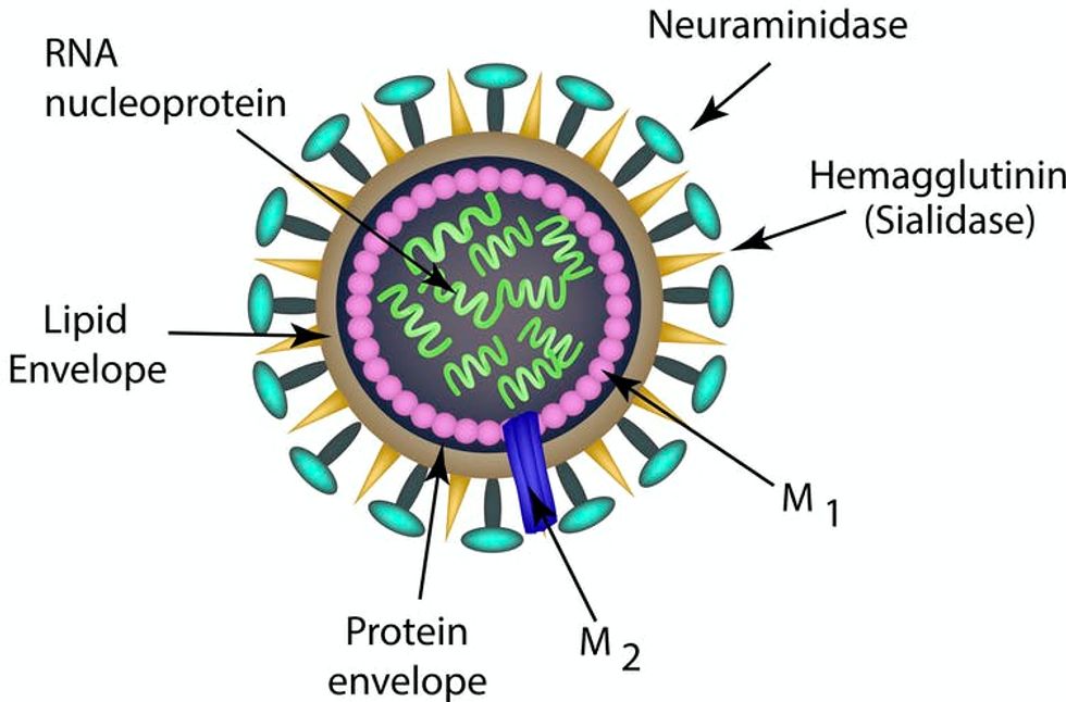 Viruses consist of protein packages surrounding the viral genome, which, in the influenza virus, consists of RNA divided into eight separate segments. The influenza virus is enveloped by a membrane layer derived from the host cell. Sticking through this membrane are spikes made up of the proteins haemagglutinin (HA) and neuraminidase (NA), both of which are required for the virus to successfully cause an infection.