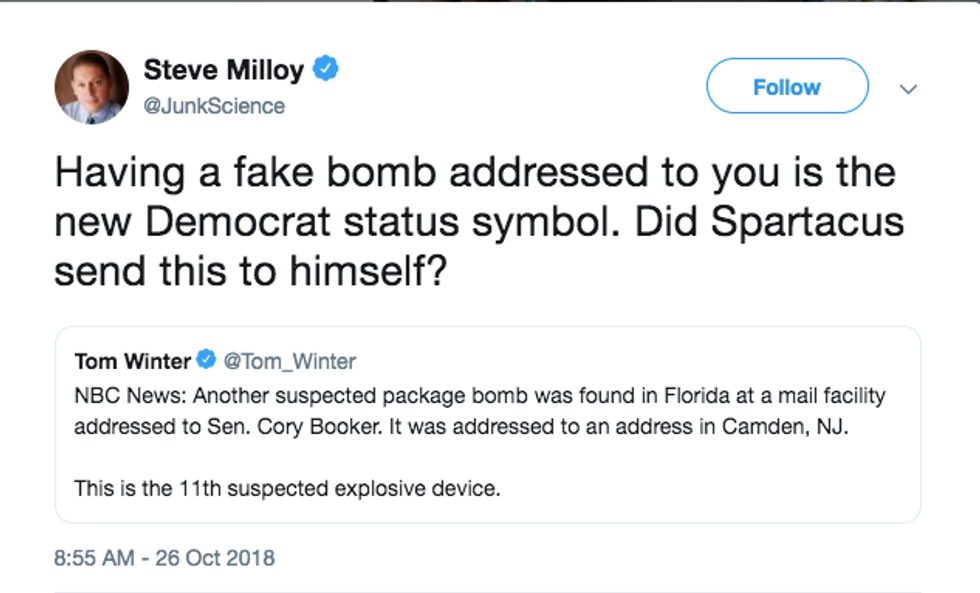 "Having a fake bomb addressed to you is the new Democrat status symbol," Milloy tweeted. "Did Spartacus send this to himself?"