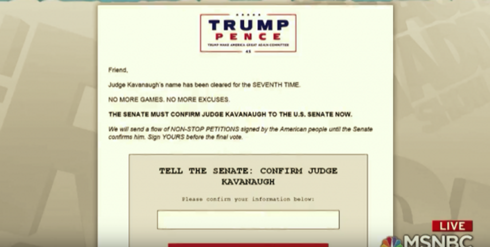 "THE SENATE MUST CONFIRM JUDGE KAVANAUGH TO THE U.S. SENATE NOW," the petition email read.