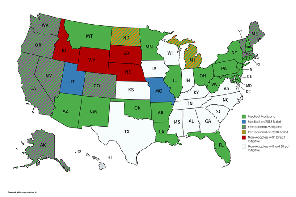 Of the 19 U.S. states that have no form of legal marijuana, only six – Idaho, Wyoming, South Dakota, Nebraska, Utah and Missouri – allow for direct initiatives.