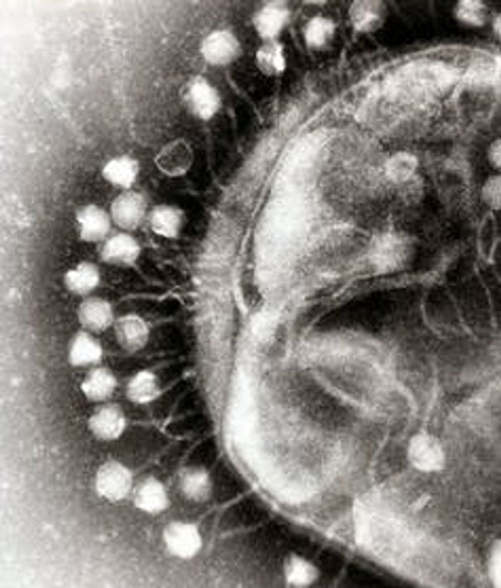 Transmission electron micrograph of multiple bacteriophages attached to a bacterial cell wall.