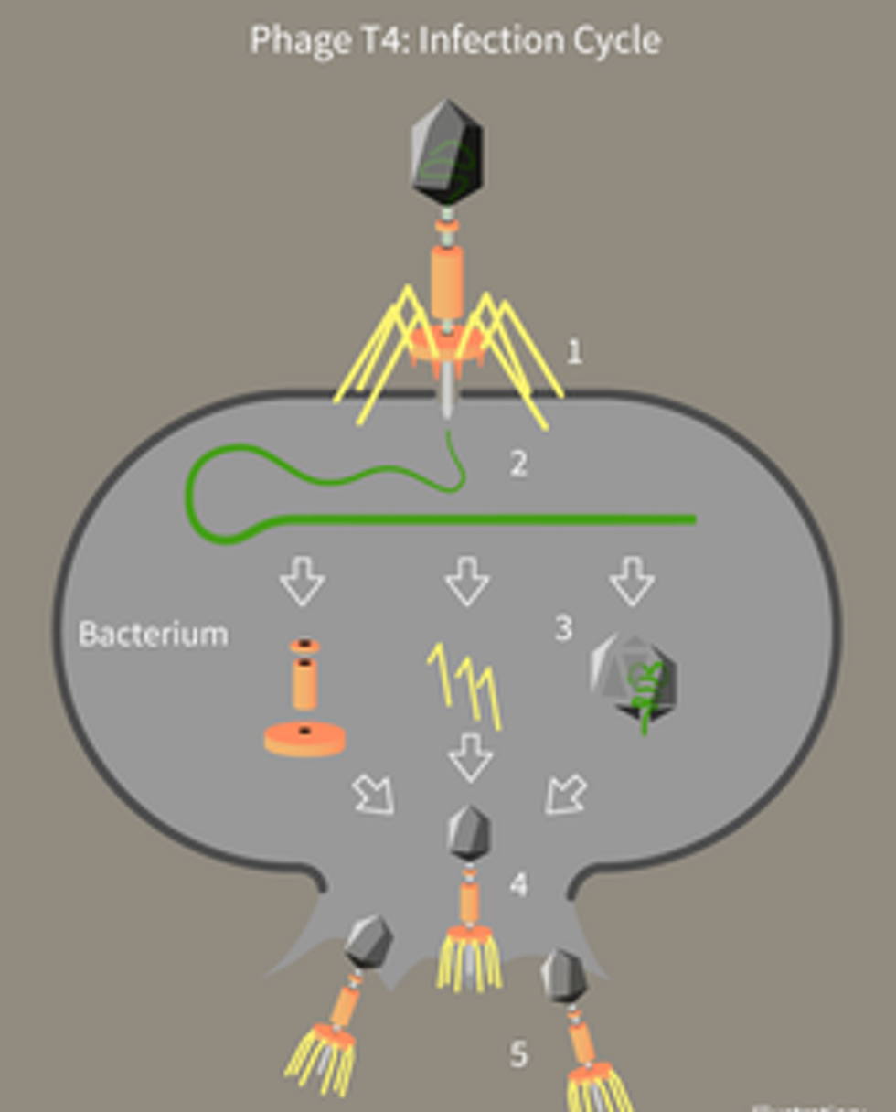 A virus called a bacteriophage infects bacteria and inserts its genetic material into the cell. The bacterium ‘reads’ the genetic instructions and manufactures more viruses which destroy the bacterium when they exit the cell.