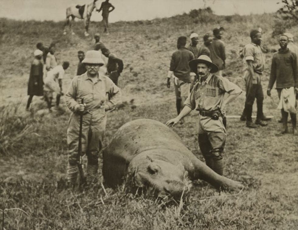 Theodore Roosevelt and unidentified man standing over a killed hippopotamus. In the background are African workers who will skin the animal. July-December, 1909, during the Smithsonian/Roosevelt African Expedition of 1909-1910.