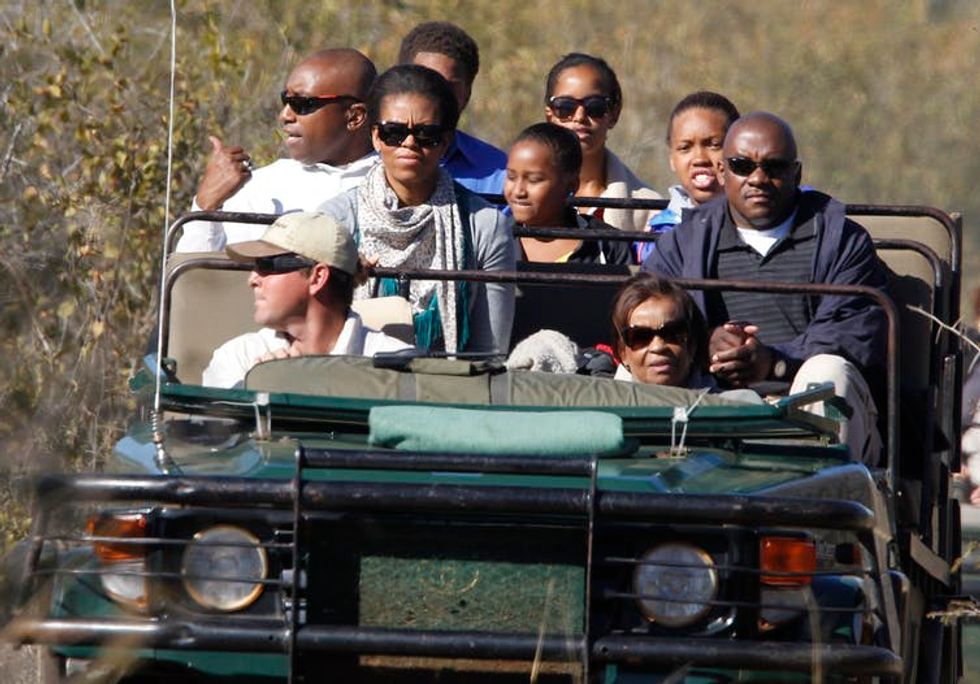 Former U.S. first lady Michelle Obama and her family ride their safari vehicle in Madikwe Game Reserve in South Africa in June 2011.