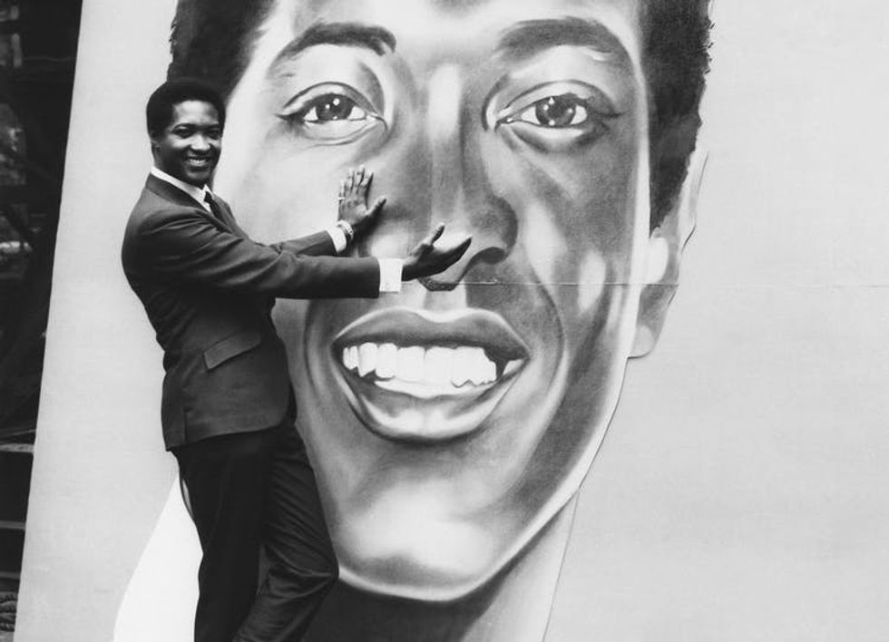 Singer Sam Cooke stands next to a huge reproduction of his head on the roof of a Manhattan building.