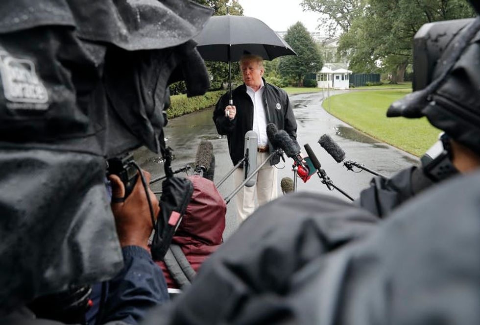 Trump talks to the media before boarding his official helicopter.