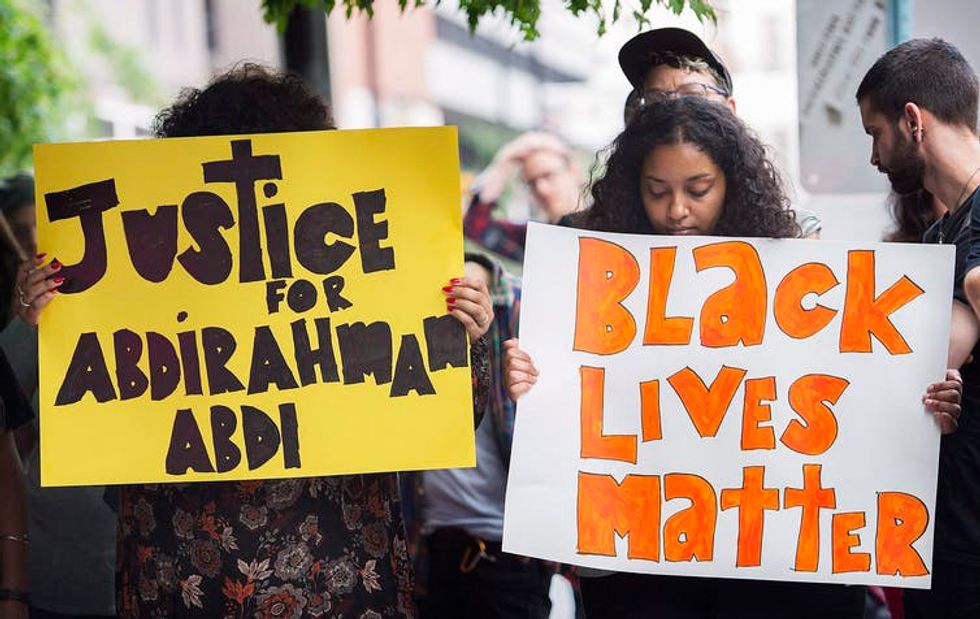 People gather in Montréal, Thursday, July 28, 2016, to denounce the death of Abdirahman Abdi who was killed after a confrontation with police in Ottawa.
