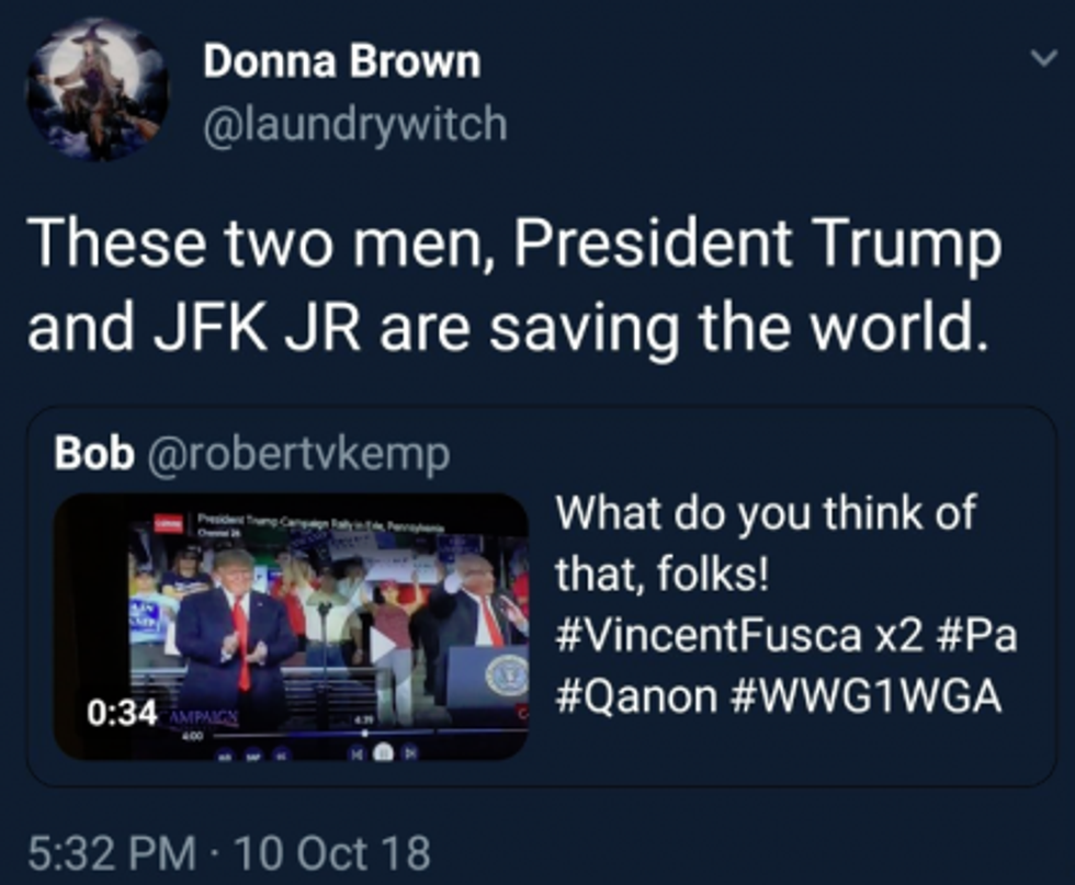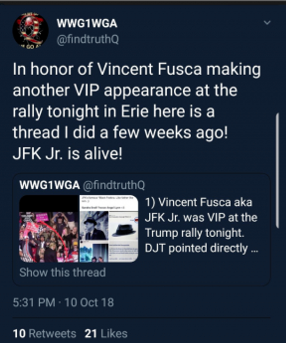 The reason this caused such excitement, View explains, is that QAnon supporters believe that Fusca is actually JFK Jr., as documented by the tweets below.