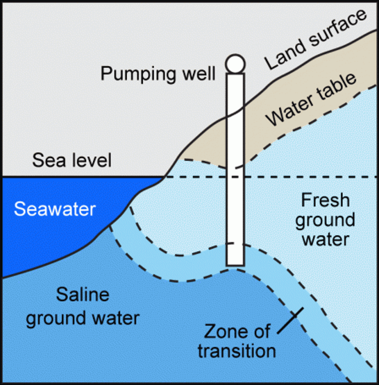 Sea level rise plus increased groundwater pumping can promote saltwater intrusion into groundwater aquifers, increasing treatment costs or rendering wells unusable.