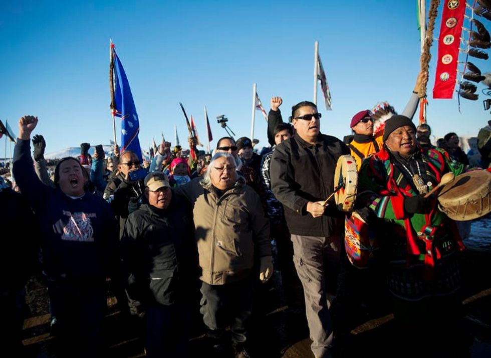 Protesters march at Oceti Sakowin camp, where people have gathered to protest the Dakota Access oil pipeline in Cannon Ball, North Dakota, Dec. 4, 2016.