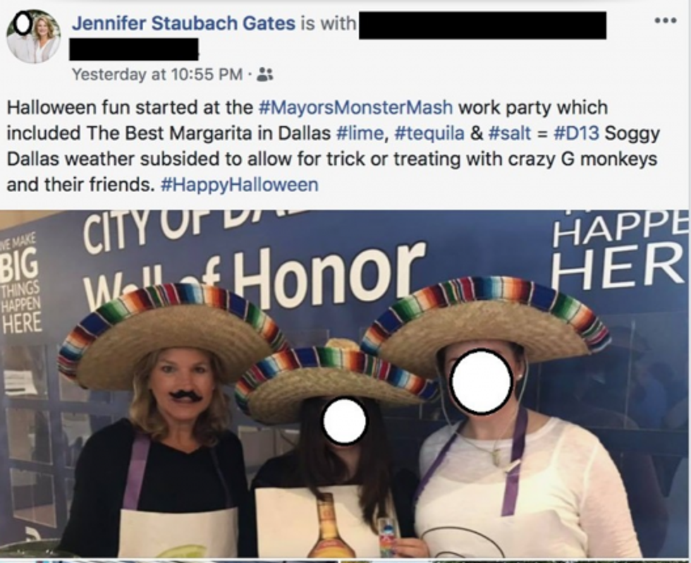 The post (see screenshot below) has since been taken down, with the Observer's Jim Schutze noting, "Some political observers — well, me — have always wondered how Gates, a product of affluent white North Dallas, would establish rapport with voters as a citywide candidate in a blue-voting diverse city. The photo of herself on Facebook in what could be called brown-face answers that question. Not well."