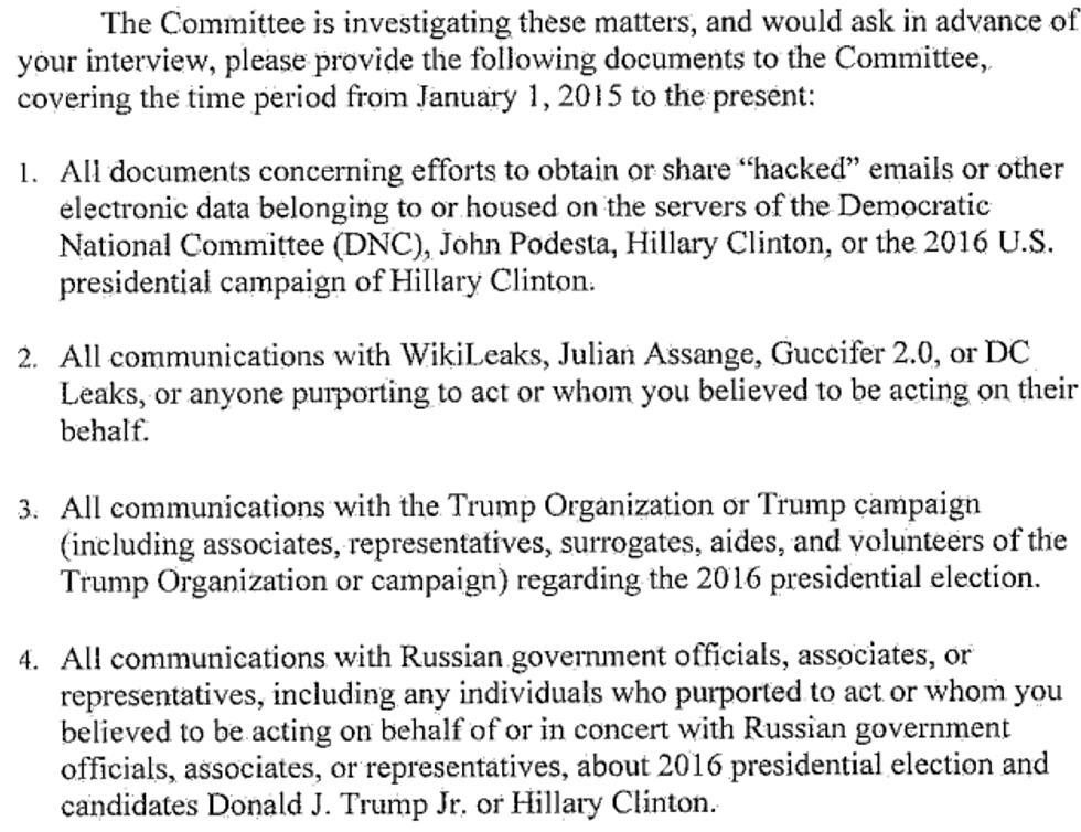 Feinstein had requested "communications related to hacked emails, communications with Russian hackers of Wikileaks, and communications with the Trump campaign."