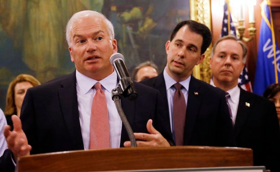 Republican Senate Majority Leader Scott L. Fitzgerald, left, Gov. Scott Walker, center, and Assembly Speaker Robin Vos, right.