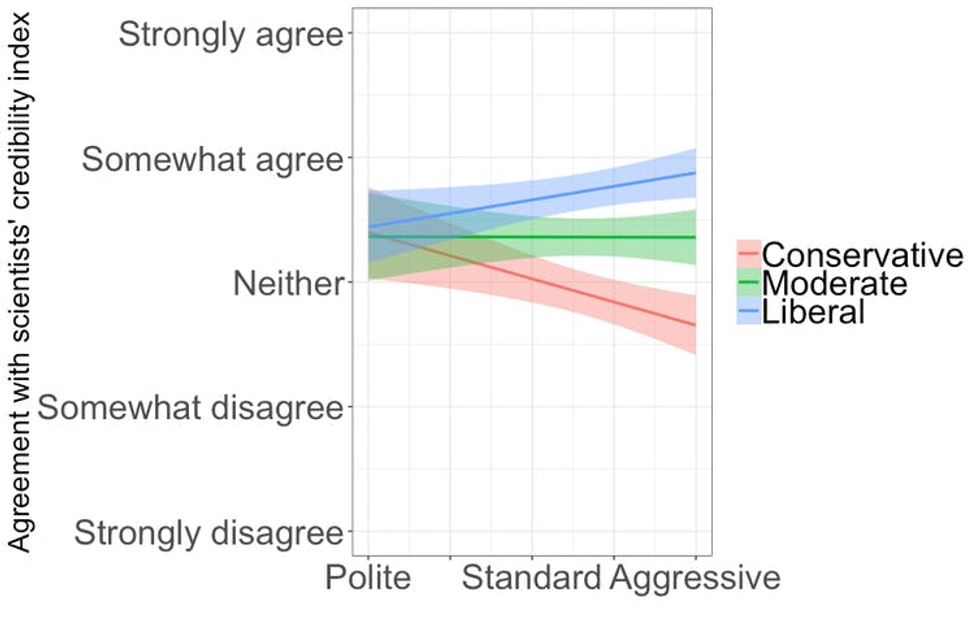 What we ultimately found was that the level of perceived aggressiveness coupled with the “war on science” framing generally led conservatives, liberals and moderates to rate the credibility of scientists differently.