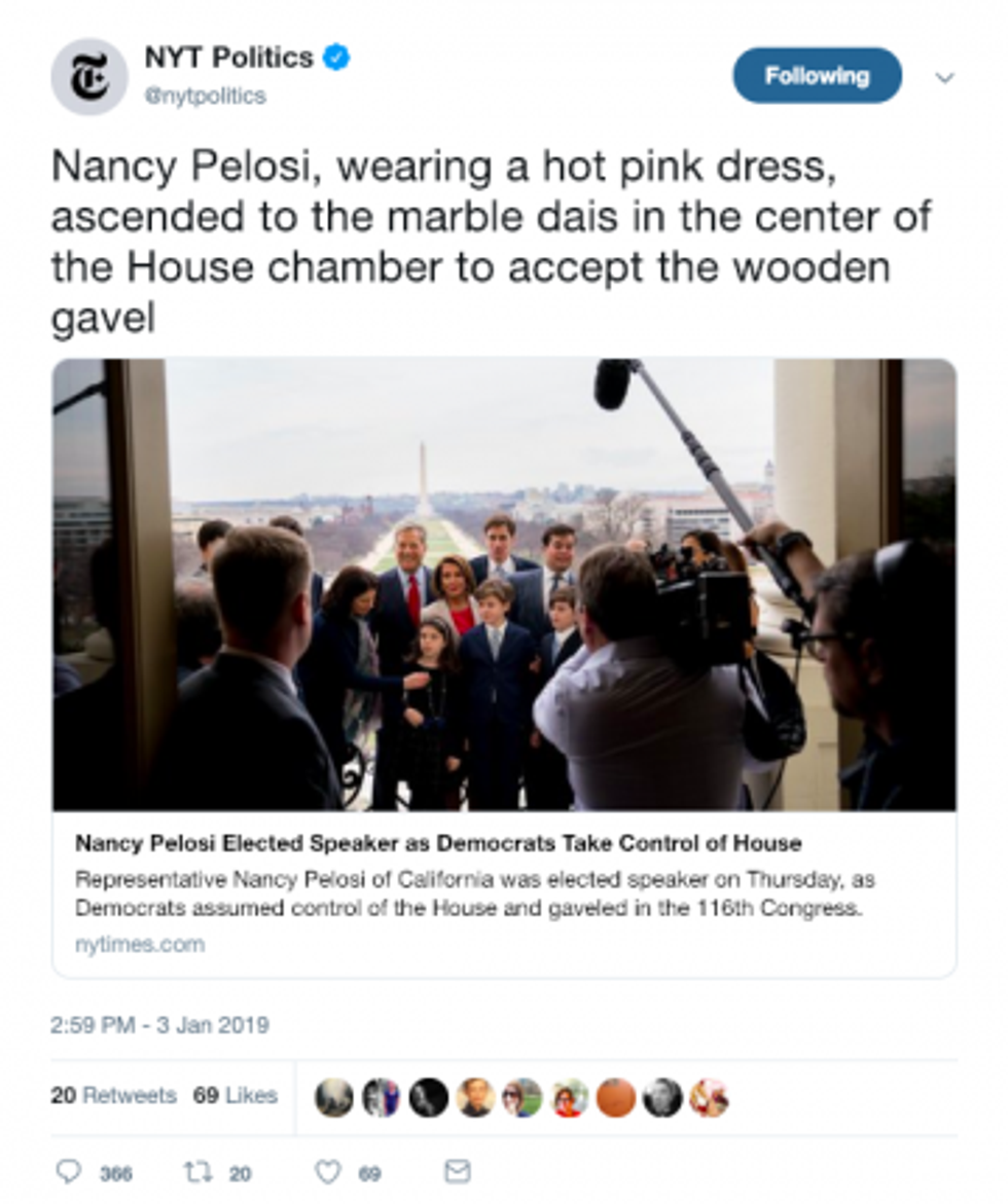 While tweeting a New York Times story on the election of Speaker Nancy Pelosi (D-CA), the paper's politics account led with a description of what she was wearing.