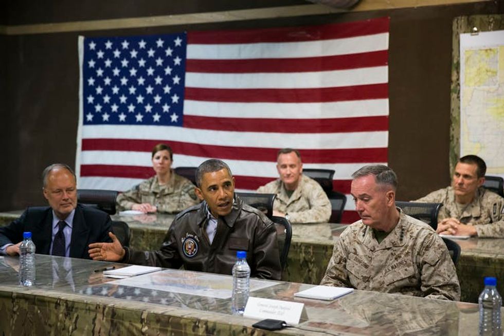 President Barack Obama, center, is briefed by Marine General Joseph Dunford, commander of the US-led International Security Assistance Force, right, and US Ambassador to Afghanistan James Cunningham, May 25, 2014, Afghanistan.