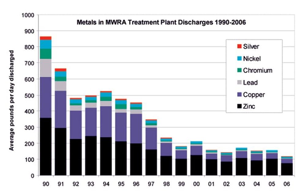 Metals in MWRA treatment plant discharges to Boston Harbor and Massachusetts Bay have declined by more than 80 percent as a result of the harbor cleanup.