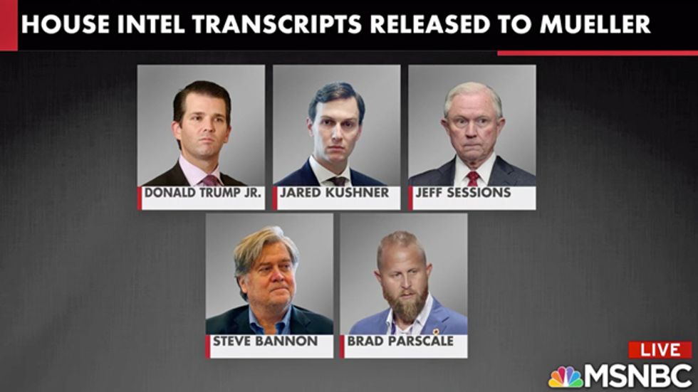 "The House Intel transcripts were released to Mueller as Chairman [Adam] Schiff promised," Hayes reported. "It's the first sort of major action that the chair has taken in his capacity: Don Jr. Jared Kushner, Jeff Sessions, Steve Bannon and Brad Parscale."