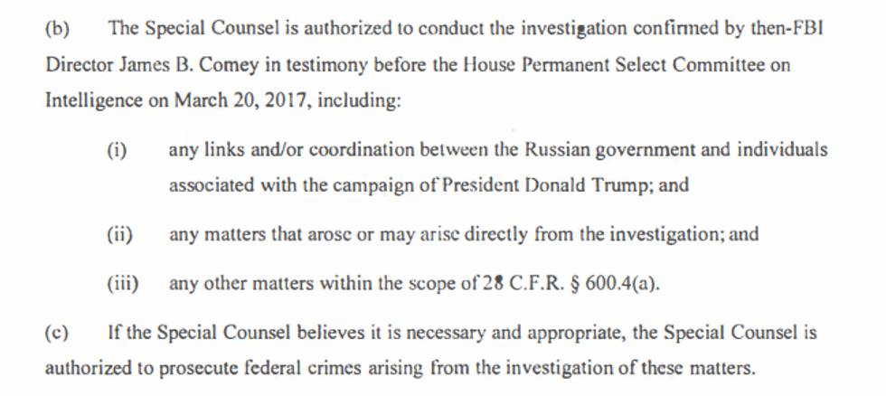 Rosenstein continued: “If the Special Counsel believes it is necessary and appropriate, the Special Counsel is authorized to prosecute federal crimes arising from the investigation of these matters.”
