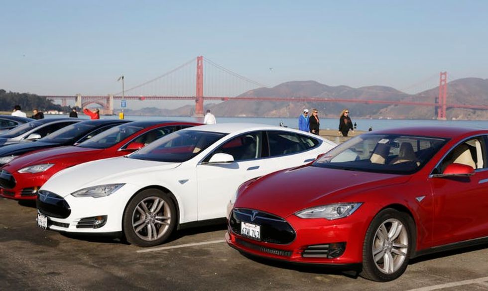Electric sedans line the street in San Francisco.
