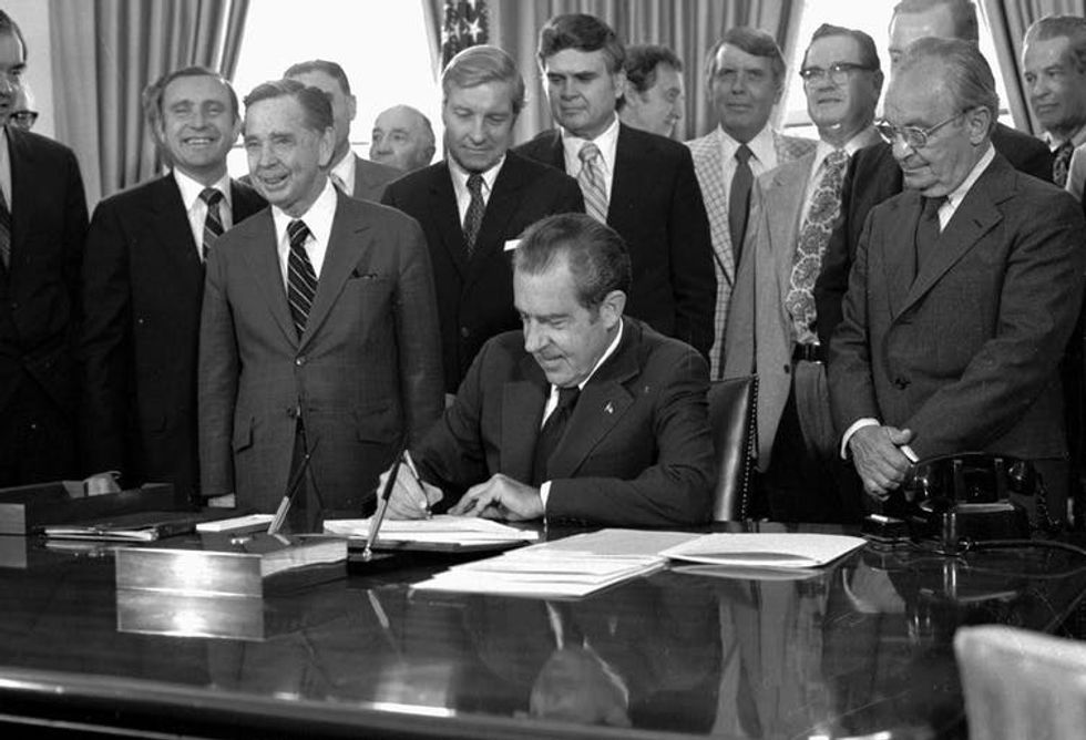 Richard Nixon signs a bill July 12, 1974, in the White House, giving Congress tighter control of the budget process.
