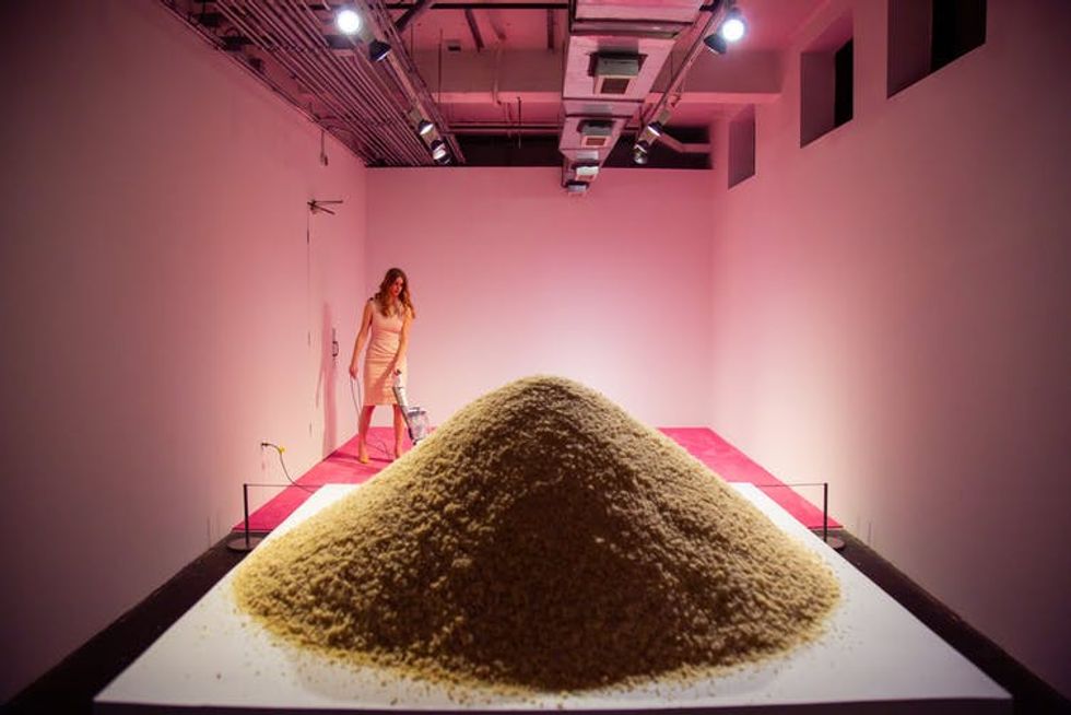 As she appears to be on the cusp of completing the task, spectators soil the carpet with bread crumbs. She vacuums them up. The audience tosses more crumbs onto the carpet. The pattern repeats itself.