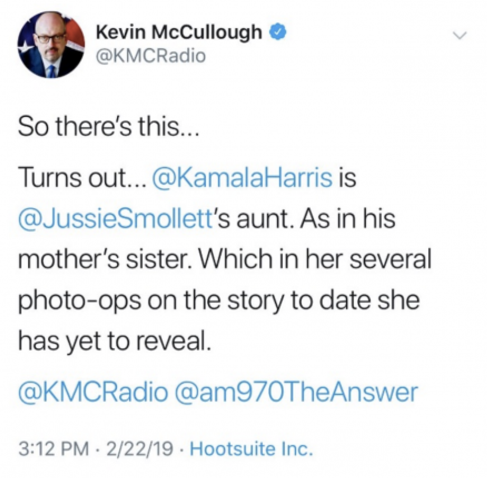 "So there is this...." McCullough tweeted, "Turns out @KamalaHarris is @JussieSmollett's aunt. As in his mother's sister. Which in several of her photo-op updates on the story to date she has yet to reveal."