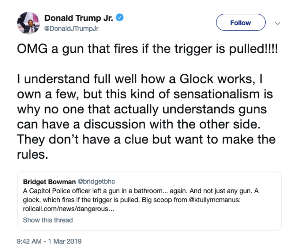 "OMG a gun that fires if the trigger is pulled!!!!" Donald Trump Jr. tweeted. "I understand full well how a Glock works, I own a few, but this kind of sensationalism is why no one that actually understands guns can have a discussion with the other side. They don’t have a clue but want to make the rules."