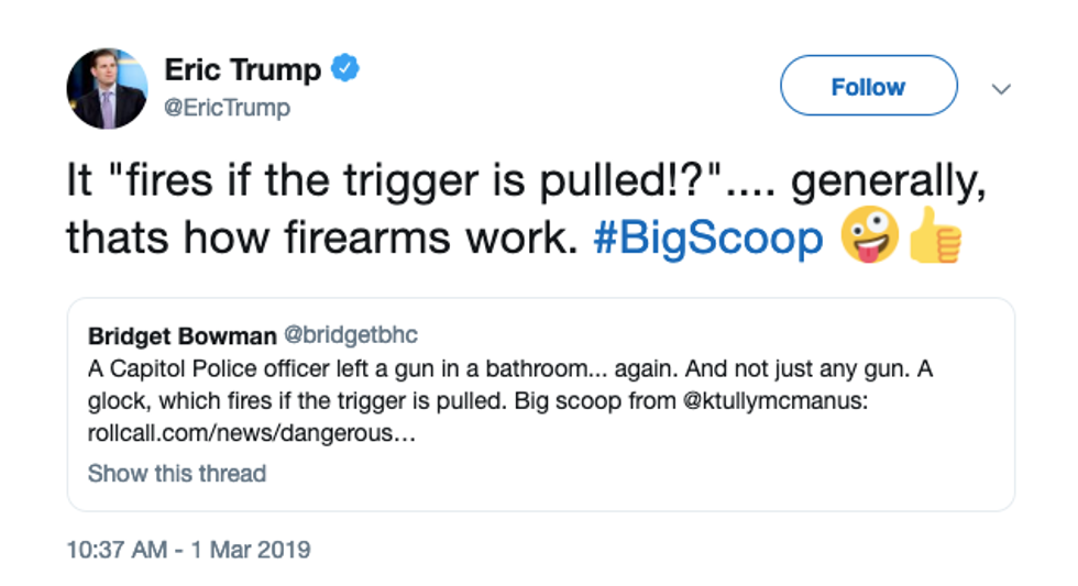 "It 'fires if the trigger is pulled!?'" Eric Trump tweeted a half hour later. 'Generally, thats how firearms work. #BigScoop"