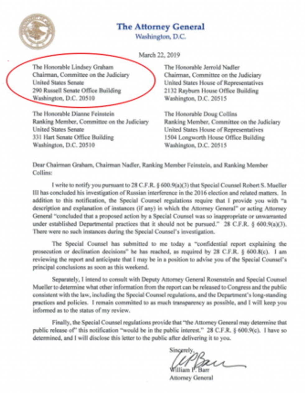 Senate Judiciary Chairman Lindsey Graham, whose name appears first on Attorney General William Barr's letter to Congress (copy below), has emerged as one of President Donald Trump's top defenders. He is also responsible for determining how the Senate will move forward on the information it receives from the nearly-two-year long Mueller investigation into Russia's attack on U.S. electoral system and if Donald Trump or any members of his teams conspired with that hostile foreign power.