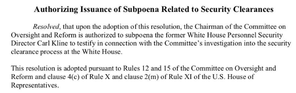 Included is a resolution by the committee's chair, Rep. Elijah Cummings (D-MD), that would authorize the issuances of a subpoena for former White House Personnel Security Director Carl Kline.