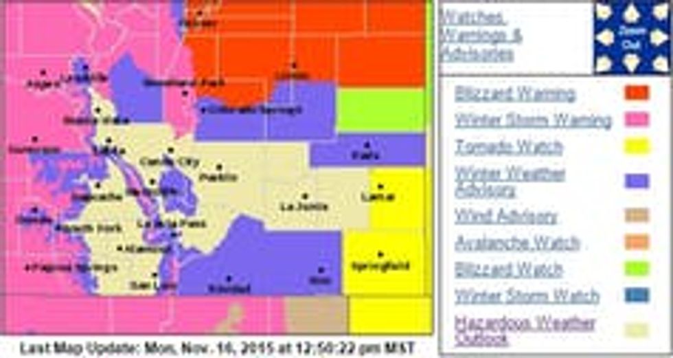 This November 2015 forecast shows simultaneous warnings in eastern Colorado for wildfires, tornadoes and a blizzard.