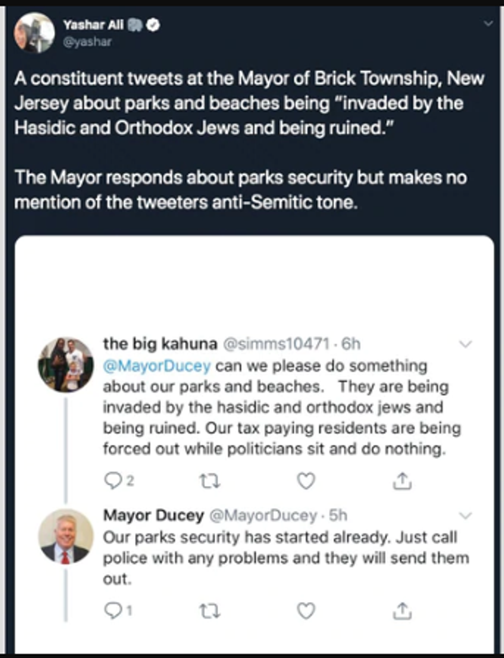 “@MayorDucey can we please do something about our parks and beaches. They are being invaded by the hasidic and orthodox jews and being ruined. Our tax paying residents are being forced out while politicians sit and do nothing,” said @simms10471. Understandably, the account has now been deleted, but not before screen captures were taken.