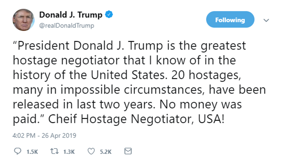 "'President Donald J. Trump is the greatest hostage negotiator that I know of in the history of the United States,'" Trump wrote, quoting the unidentified source. "'20 hostages, many in impossible circumstances, have been released in last two years. No money was paid.' Cheif Hostage Negotiator, USA!"