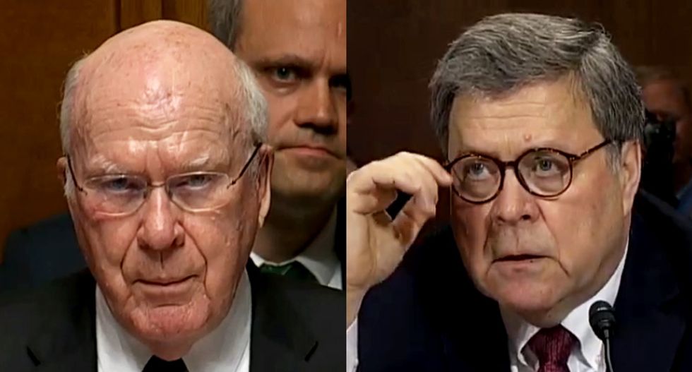 Democratic Sen. Patrick Leahy of Vermont went after Attorney General William Barr with a vengeance during his Wednesday morning testimony before the Senate Judiciary Committee. Barr was questioned about the letter he sent to Congress on March 24, when the attorney general offered an assessment of the findings of special counsel Robert Mueller’s final report for the Russia investigation. Mueller has disagreed with Barr’s characterization of his report, and Leahy addressed that disagreement when questioning Barr.