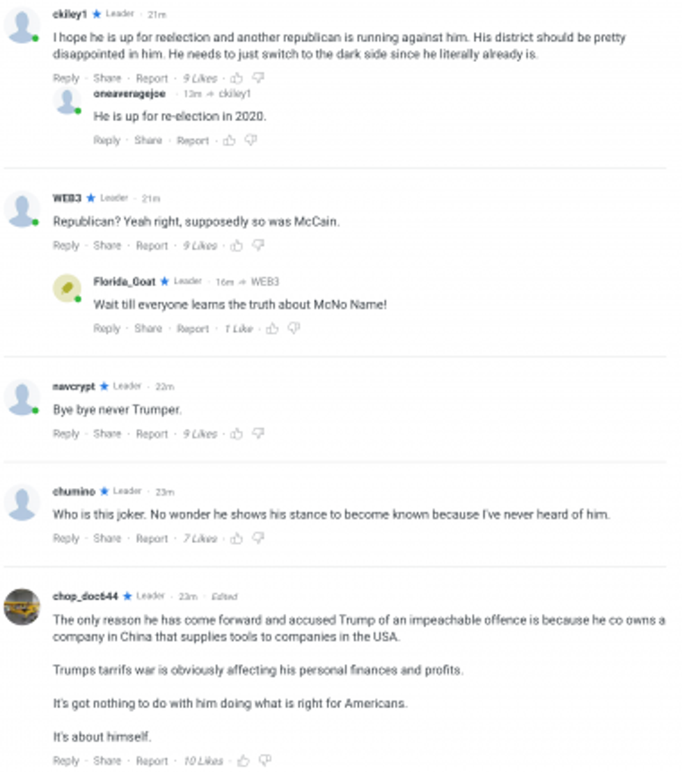 Responding to a suprise tweetstorm from Rep. Justin Amash (R-MI) late Saturday, saying President Donald Trump has committed impeachable offenses without directly calling for impeachment, Fox News fans lit up the comments section on the network's website calling for congressman to step down -- along with some racist insults.